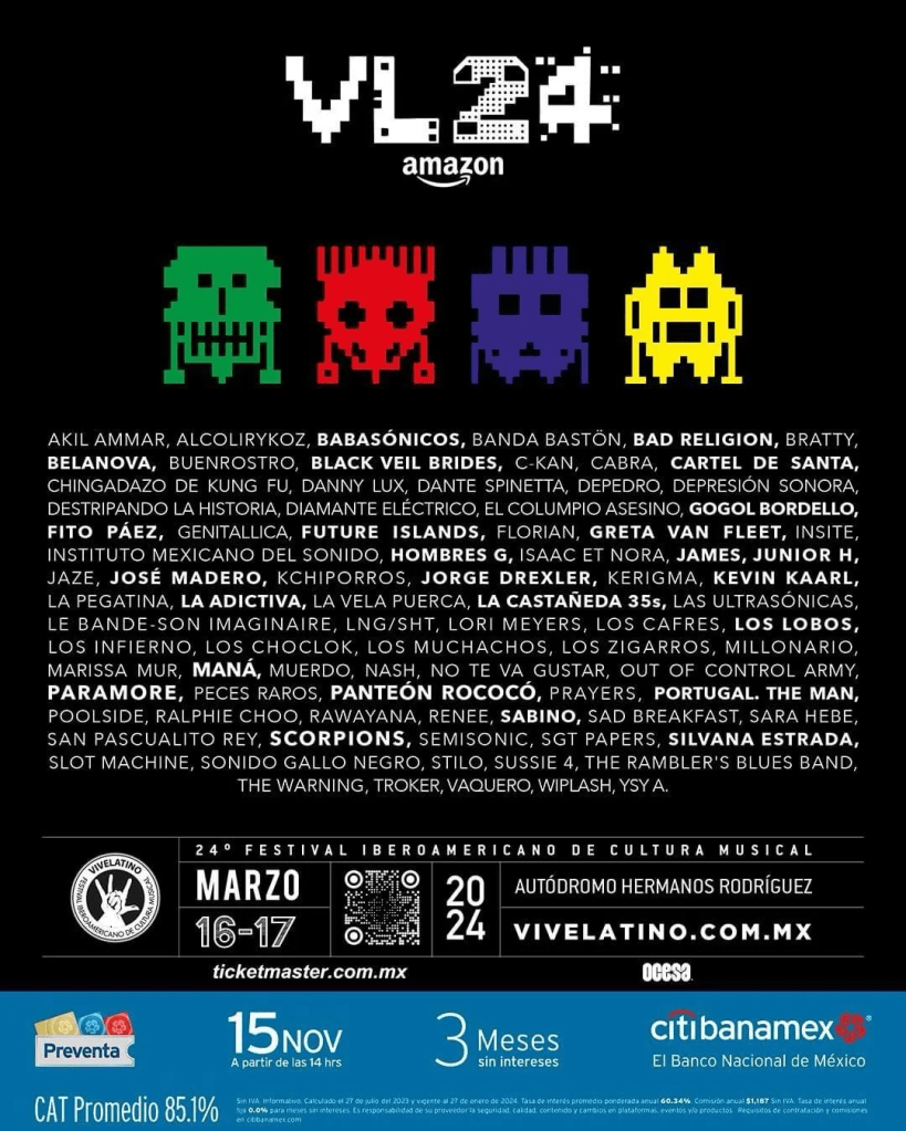 - Vive Latino: 16 y 17 de marzo en el Autódromo Hermanos Rodríguez.