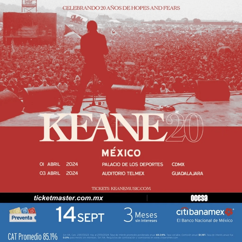 - Keane: 1 de abril en el Palacio de los Deportes y 3 de abril en el Auditorio Citibanamex.