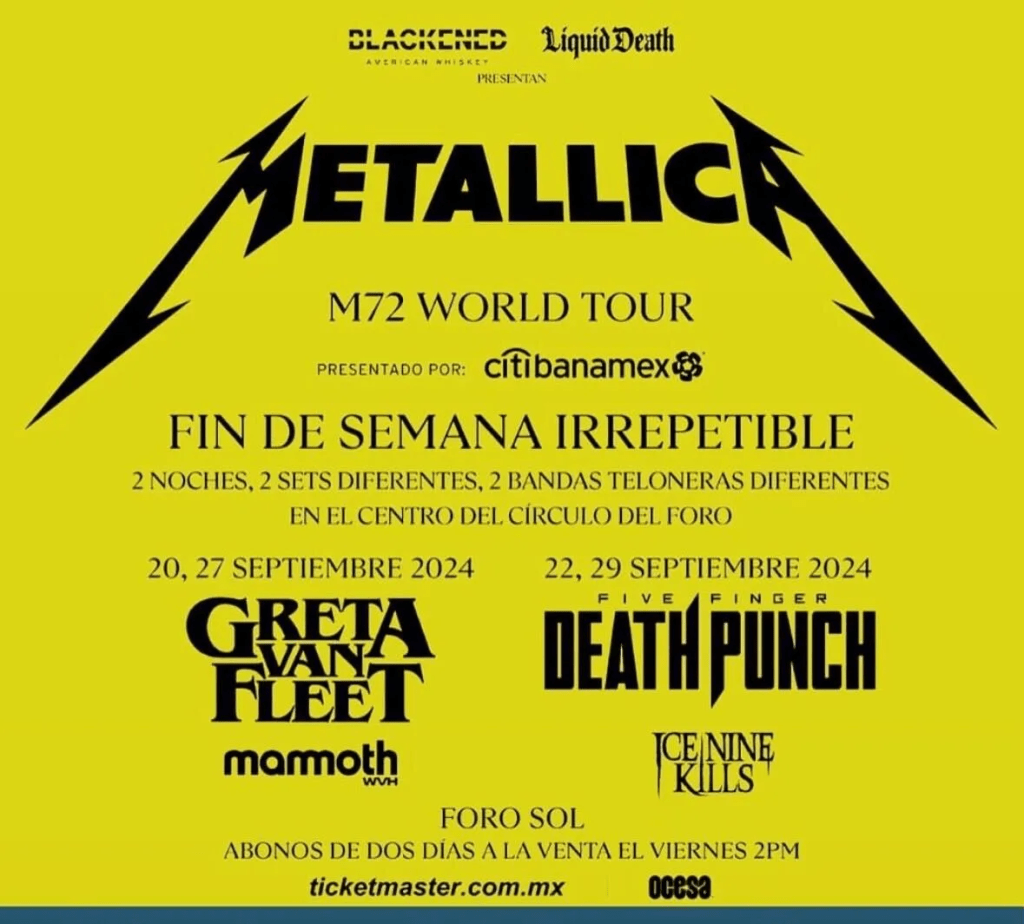 - Metallica: 20, 22, 27 y 29 de septiembre en el Foro Sol.