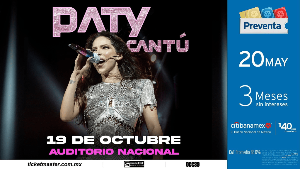 Los fans de Paty Cantú podrán disfrutar de su talento en solitario el próximo 19 de octubre en el Auditorio Nacional. Los boletos estarán disponibles en Preventa Citibanamex el 20 de mayo, mientras que la venta general comenzará el 21 de mayo en las taquillas del Auditorio y a través de Ticketmaster. ¡No te pierdas la oportunidad de ser parte de esta noche inolvidable!